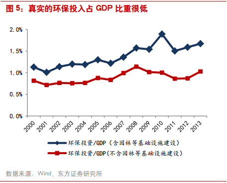 對(duì)于環(huán)保產(chǎn)業(yè),投資者一直存在一個(gè)疑問:官方口徑的投資力度很大,但從企業(yè)端看,規(guī)模卻很小,業(yè)績(jī)平淡。本質(zhì)上原因是我們的環(huán)保投入統(tǒng)計(jì)口徑問題,實(shí)際投入確實(shí)很小。按照世界慣例,環(huán)保投入需占當(dāng)?shù)谿DP的2-3%,方能保障環(huán)境污染不再加劇,而之前20多年我們的環(huán)保投入長(zhǎng)期保持在1%以下。剔除園林投入后,“十二五”的年環(huán)境治理投入僅在4000-5000億元。